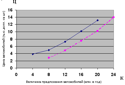 Рис. 4. Увеличение предложения автомобилей Предложение автомобилей возрастает с уменьшением затрат или увеличением конкуренции со стороны Японии.