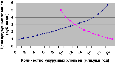Что происходит на рынке кукурузных хлопьев? Низкий урожай приводит к тому, что производители изготовляют меньше кукурузных хлопьев по старой цене, и величина спроса превосходит величину предложения. Поэтому, цена за упаковку кукурузных хлопьев возрастает, стимулируя производство и, таким образом, приводя к росту величины предложения, и одновременно - к сдерживанию потребления и снижению величины спроса. Цена продолжает расти до тех пор, пока величина предложения и величина спроса вновь не станут равными.