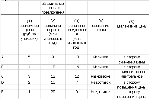 Только при равновесной цене в 3 руб. за упаковку величина предложения будет равна величине спроса. При слишком низкой цене будет иметь место дефицит товара и его цена будет расти, при слишком высокой цене -излишек (избыток), который будет снижать цену товара. Пусть теперь цена равна 2 руб. Улучшит ли она ситуацию на рынке?