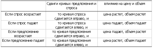 Таблица 6. Влияние различных сдвигов кривых предложения и спроса на цену и объем