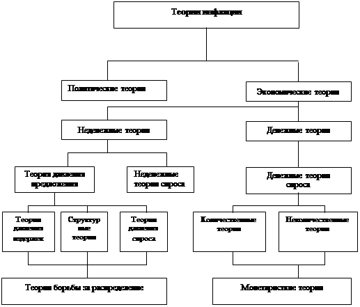 Как видно из данной схемы, все теории инфляции в самом общем виде можно разделить на экономические и политические. Политические теории связывают причину инфляции с факторами, находящимися вне сферы собственно экономики: войной, милитаризацией и т.п.