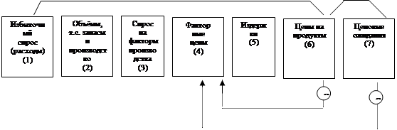 Однако если спрос на факторы производства продолжает устойчиво возрастать (блок 3), то это, в конце концов, приводит к росту цен на них (блок 4); именно цены на факторы производства и труд (особенно — не охваченный профсоюзным движением) наиболее чувствительны к увеличению спроса. Но с увеличением цен на факторы производства начинают возрастать издержки (блок 5), а это уже вызывает рост цен на готовую продукцию (блок 6). Именно с этого момента начинает проявлять себя собственно инфляция.