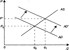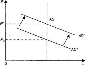 Инфляцию спроса при полной занятости и полной загруженности мощностей изображает следующий график (рисунок 3), где А D ° и А'О'— кривые спроса, АS — кривая предложения, а рост цены (Р' - Р o ) происходит при том же уровне выпуска (Q 1).