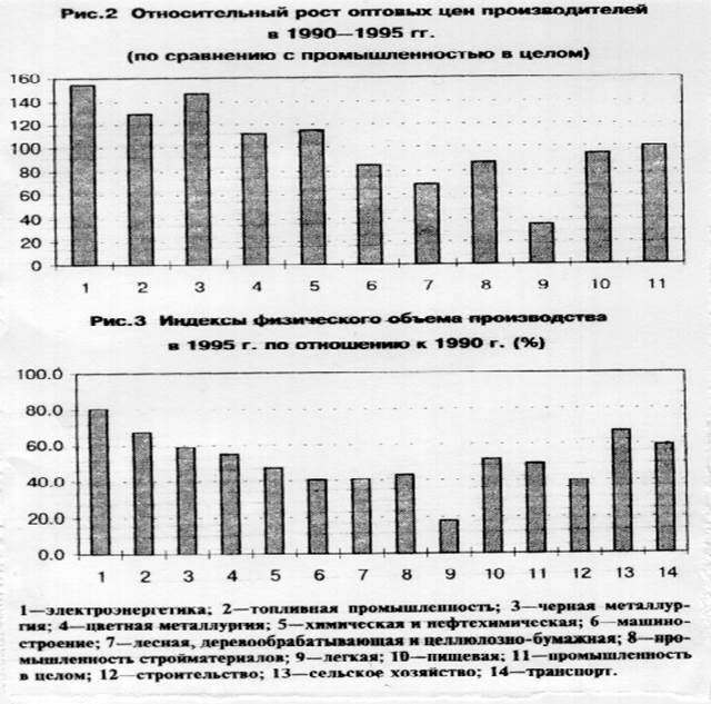 Приведенные данные свидетельствуют, что соотношения цен существенно приблизились к соотношениям цен на мировых рынках. Обращает на себя внимание тот факт, что близкую зависимость имеют и индексы спада. Очевидно, эти показатели менялись в тесной зависимости. Перераспределение добавленной стоимости, происходившее в рамках инфляции, определялось преимущественно "силой" сторон в переговорах о ценах поставок. Здесь играли роль следующие факторы: