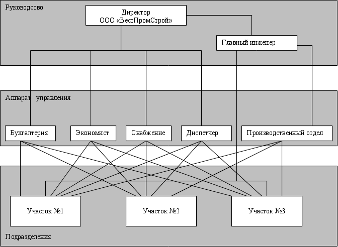Аппарат управления Бухгалтерия Экономист Снабжение Диспетчер Производственный отдел Руководство Директор ООО «ВестПромСтрой» Главный инженер Подразделения Участок №1 Участок №2 Участок №3