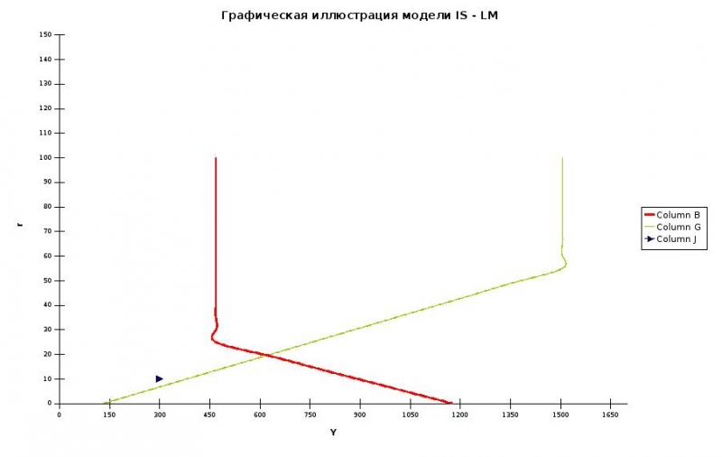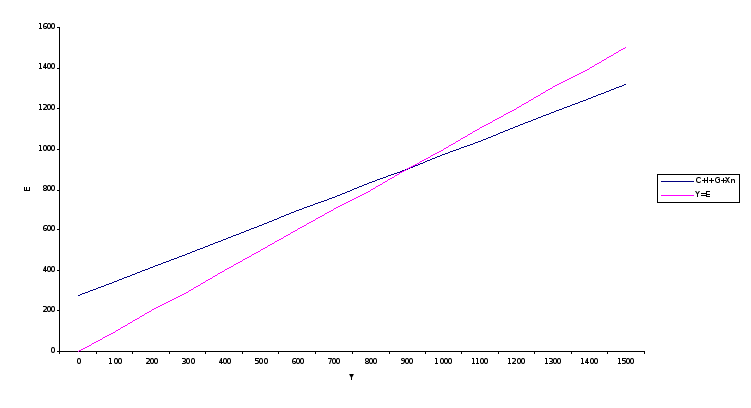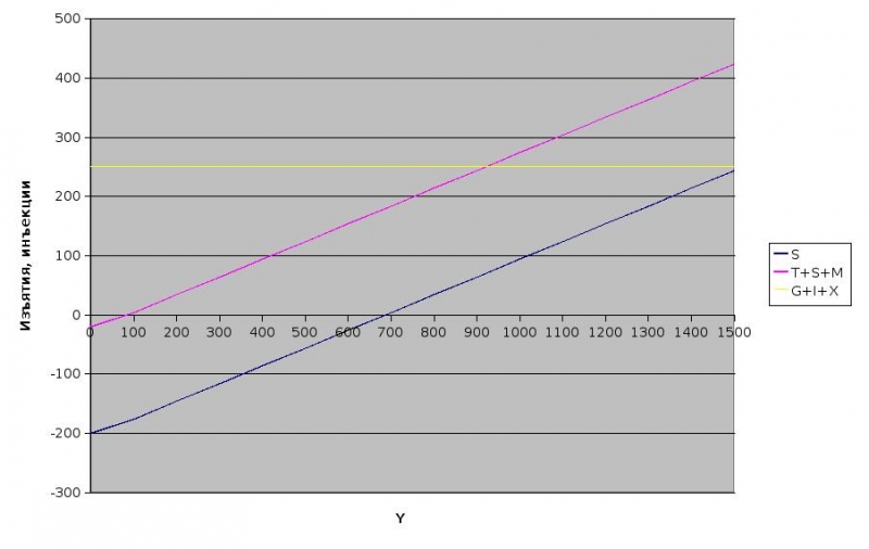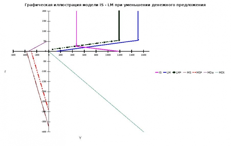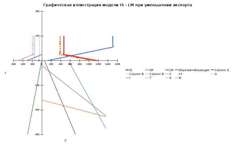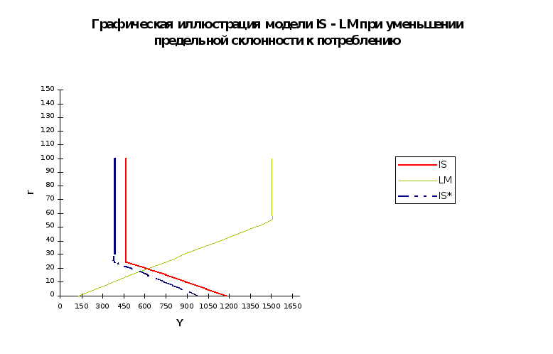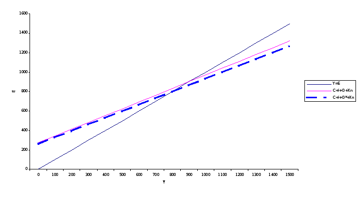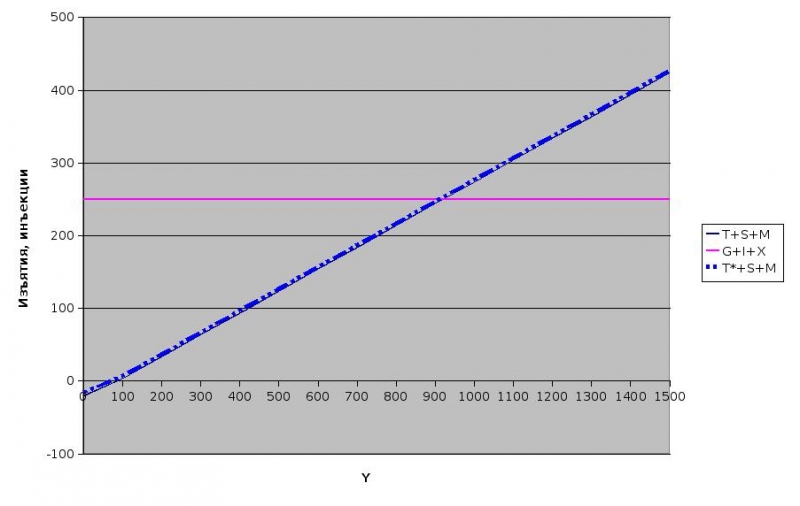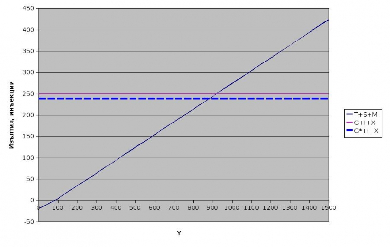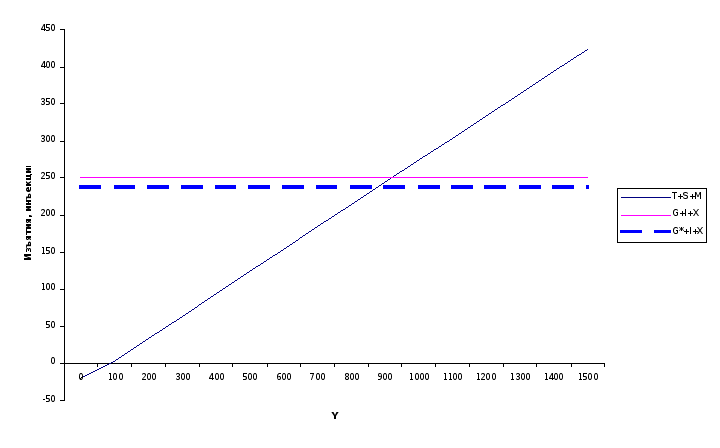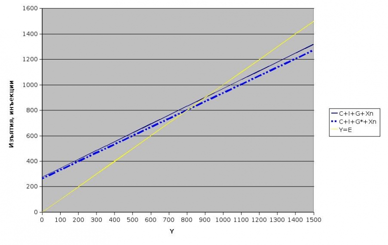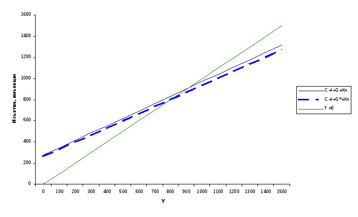 Поскольку Ка+ℓ=1,2704>1, нарушенное равновесие в экономике больше не восстановится, и график развития дальнейших событий будет выглядеть так: