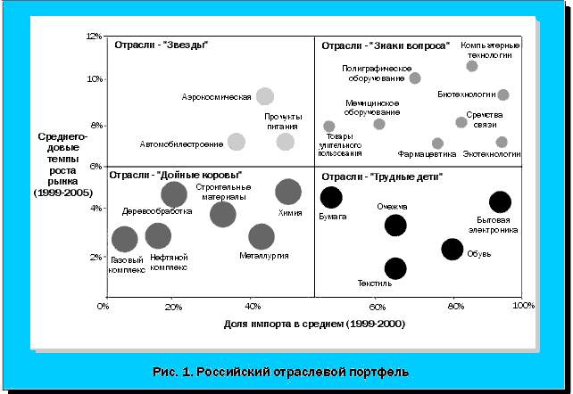 С учетом вышесказанного можно говорить о целевом развитии отдельных предприятий в наиболее перспективных отраслях. По мнению некоторых экономистов, Необходимо наметить 7-8 макротехнологий, по которым Россия может занять передовые позиции и быть конкурентоспособной на мировом рынке наукоемкой продукции. Прогноз развития мировой экономики до 2015 г. показывает, что только внешний рынок наукоемкой продукции составит около 6 трлн. долл. в год, из которых около 2 трлн. придутся на информационные услуги. При благоприятном стечении обстоятельств РФ может иметь на этом рынке 8-12%, или 500-600 млрд. долл. в год. /16/ Именно это может стать стратегической задачей развития.