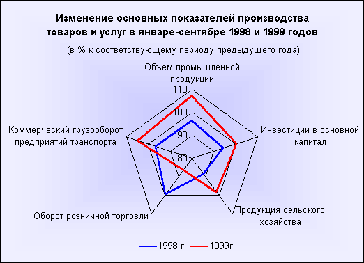 Ниже приводится диаграммы (радары), характеризующие изменения основных показателей производства товаров и услуг в сентябре и январе-сентябре 1998 и 1999гг. (в % к соответствующему месяцу предыдущего года):