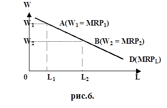 Кривая спроса на труд со стороны руководителя фирмы есть кривая предельной производительности труда MRPL по его цене W.