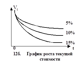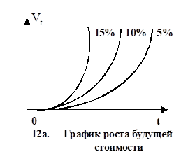 Из графика 12а. следует, что чем выше ставка процента и чем больше срок начисления процентов, тем выше будущая стоимость Vt . Из график 12б. следует, что чем позже ожидается доход и чем больше процентная ставка, тем меньше его текущая (дисконтированная) стоимость.
