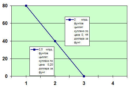 Как таблица, т ак и график показывают величину спроса на цыплят при различных ценах. Например, по цене 0,40 доллара за фунт покупатели желают и могут приобрести 2 млрд. фунтов цыплят в год. Этой' комбинации цены и количества соответствует ряд А в части (а) и точка А в части (б).