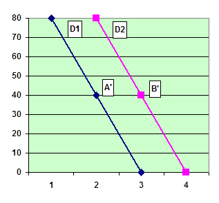Возрастание цен ы говядины с 1 доллара до 1,5 долларов за фунт при прочих равных услов иях прив одит к передвижению точки А в точку В криво й сп роса на говядину (уменьшается за прошенное количество говядины). При н еизменн ой цене цыпленка 0,40 доллара за фунт потреби тели б удут заменять говядину цыплятами. Это приведет к росту спро са на цыплят, ч то показано сдвигом кривой спроса из по ложени я D 1 в D2.