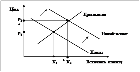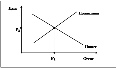 Перехід до складнішої моделі взаємозв'язку передбачає зіставлення інтересів виробників і споживачів відповідно до пропозиції й попиту і пошук місця їх оптимального поєднання. Графічно така ситуація зображена на рис.3.