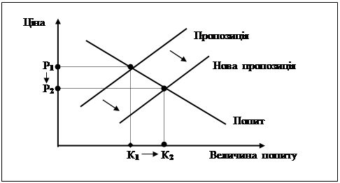 Із зміною інших факторів (техніки, доходів тощо) модель взаємодії попиту і пропозиції складніша. Так, із впровадженням нових, досконаліших швейних машин зросте продуктивність праці і знизяться витрати виробництва на пошиття однієї сорочки. Лінія попиту при цьому зміститься донизу (рис.4). Це зумовить зниження цін і зростання попиту. Ціна рівноваги знизиться.