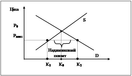 Р0 і К0 — ціни рівноваги на бензин. Уряд встановлює нижчу від рівновага ціну, вище якої продавці не мають права реалізовувати бензин. Це максимальна ціна — Рмакс. Внаслідок цього виробники менше вироблятимуть бензину, і пропозиція становитиме К1 . Водночас зросте попит, тому виникне дефіцит. Його обсяг становитиме К2 – К1 . Цей попит може виявитися у формі черг, обмежень, нормувань поставок, зростанні попиту на інші товари. За цих умов виробники будуть у невигідній ситуації, а виграють окремі категорії споживачів (оскільки не всі бажаючі зможуть придбати бензин).