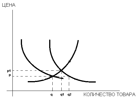 Новая кривая означает, что в связи с появлением у потребителей дополнительного денежного капитала они при каждом значении цены способны приобрести больше, чем раньше, количество товара. В силу того, что положение кривой предложения осталось в данном примере неизменным (т.е. предложение не подверглось воздействию «внешних» факторов), на рынке произошло нарушение равновесия. Новое равновесие должно установится в точке Е 0 (цена р 1 и количество q 1), которая соответствует пересечению кривых изменившегося спроса и «неизменного» предложения. В данном случае одновременно действует как связь «цена – спрос» (повышение цены ограничивает рост закупок), так и связь «спрос – цена» (увеличение платёжеспособного спроса приводит к удорожанию товара). При этом роль последней превалирует, что выражается в росте продаж, происходящем вопреки повышению цен. В то же время здесь присутствует и отрицательная связь «цена – спрос», препятствующая достижению уровня закупок товара, равного q 2 (что выше реального показателяq 1).