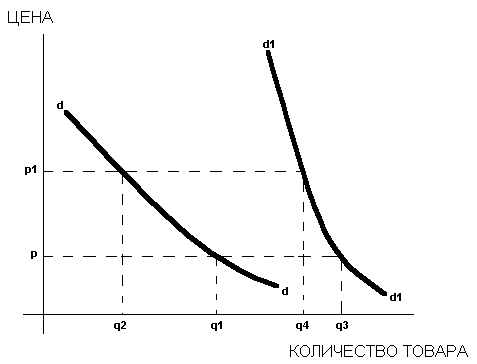 На рисунке 5 эта зависимость иллюстрируется двумя кривыми спроса, из которых первая (dd ) отражает спрос на платину в ювелирной промышленности, вторая (d 1 d 1 ) – в автомобилестроении. Как видно на рисунке, эластичному спросу соответствует более пологая кривая, неэластичному – более крутая. Рост цены на металл (р1 – р) вызывает значительно большее снижение его закупок ювелирными фирмами, чем автомобильными компаниями (q1 – q2 и q3 – q4 ) .