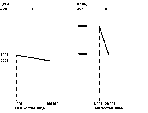 а) Покупатели экономической модели автомобиля А высокочувствительны к ценам. Они рассматривают множество моделей как взаимозаменяемые, и спрос серьезно пострадает, если цена будет слишком высокой. При цене 7 тыс. дол. Может быть подано 100 тыс. машин (доход 700 млн. дол.). Небольшое увеличение цены до 8 тыс. дол. Вызывает падение спроса до 12 тыс. штук (доход 96 млн. дол.).
