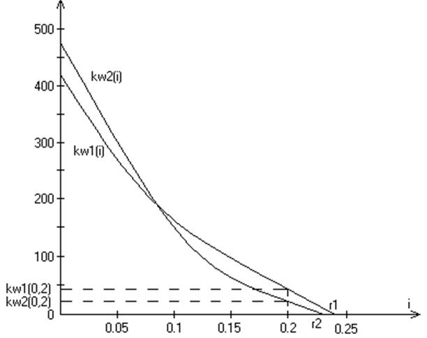 Из данного уравнения можно определить, пользуясь, методом линейной интерполяции, значения внутренних процентных ставок с любой степенью приближения. Чтобы рассчитать