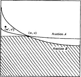 Эти свойства сравнения между формами аукциона. PI исключает случайное распределение (кроме связей) и асимметричную обработку претендентов. P2 гарантирует, что равновесие для данного правила аукциона может быть охарактеризовано семейством непрерывных кривых изобид в (w, u) пространстве. Как будет показано, наш анализ социально активного сальдо включает сравнение форм кривых изобид в зависимость от различных форм аукциона. P3 подразумевает, что кривые изобиды имеют отрицательный наклон и не имеют никакого внутреннего строения. Наконец, P4 гарантирует, что имеется добровольный тип на каждой кривой изобиде. Это последнее свойство позволяет нам сосредотачиваться на таких типах при вычислении ожидаемого дохода. Эти свойства подобны тем, которые рассматривали Rilcy и (1981) Samuelson, но, учитывая нашу двумерную частную информационную и общую функцию стоимости, P2-P4 очевидно не удовлетворительны. Тем не менее, первичные и вторичные ценовые аукционы рассматриваются, чтобы удовлетворить P1-P4 в абсолютном случае бюджета (Раздел 3). В общем окружении с Предположениями 1-4, P2 все еще должно быть проверено для каждой формы аукциона, но другие свойства удовлетворены в общих чертах.[16]