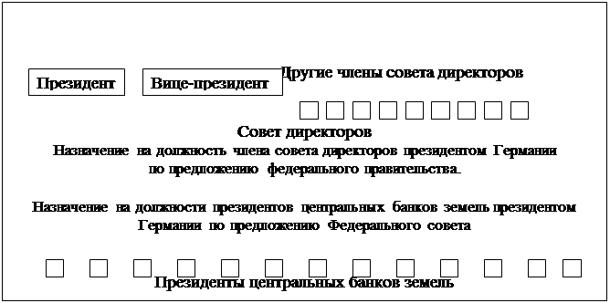 - члены руководящего органа ФРС – Совета управляющих, состоящего из 7 человек, - назначаются президентом США (с одобрения сената) сроком на 14 лет и не могут быть освобождены президентом от должности по причине его несогласия с их деятельностью, причем каждые два года заканчивается один 14-летний срок;