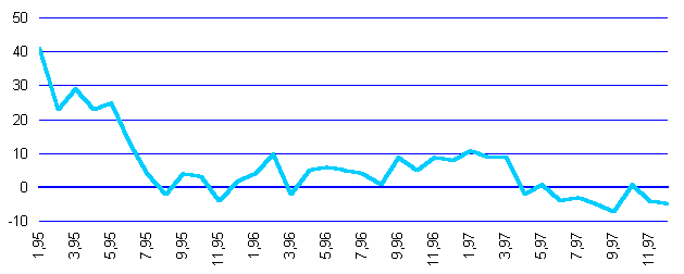 [6] Правда в 1997 году падение реальных денежных доходов населения прекратилась. Более того, имеет место некоторый их рост – на 1.5%. Это безусловно позитивная тенденция. Однако этот сравнительно небольшой рост идет на фоне крайне низкого абсолютного уровня доходов населения и практически не ощущается.