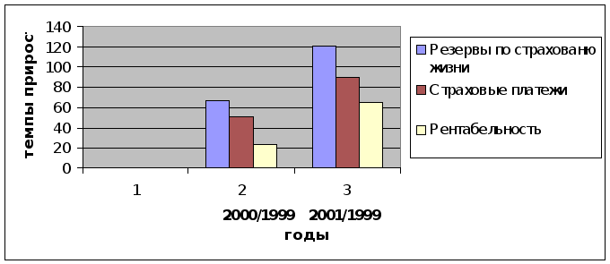 Рис.2.16 Планируемые темпы прироста резервов по страхованию жизни, страховых платежей и рентабельности АСК «Новый Днепр» в 1999-2001г.г.