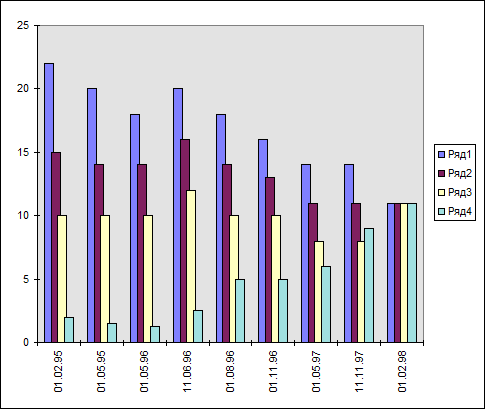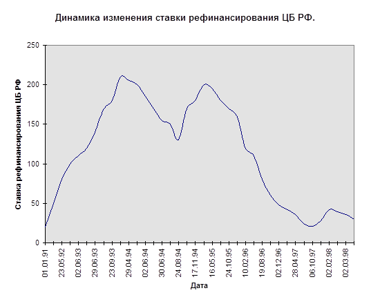 Наметившаяся в 1996 году тенденция снижения общего уровня процентных ставок получила дальнейшее развитие в 1997г. и начале 1998 г. (повышение ставки рефинансирования в ноябре 1997 года и феврале 1998 года носило антикризисный и кратковременный характер),чо тражает диаграмма 1 , отражающая динамику изменения ставки рефинансирования Банка России( построенна по данным публикуемым на официальном электронно-информационном сервере Банка Росии).