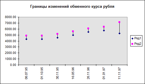 Проводимая с середины 1995 года курсовая политика Банка России, направленная на стабилизацию и предсказуемость обменного курса рубля, сыграла важную роль в нормализации макроэкономической ситуации в России. Практика установления Банком России границ допустимых изменений обменного курса рубля обеспечила предсказуемую динамику валютного курса в 1995-1997гг. Достигнутый прогресс в области финансовой стабилизации впервые позволил установить в 1997 году границы валютного коридора на весь год.