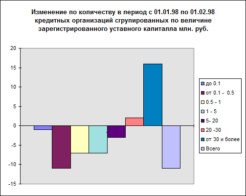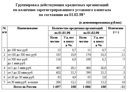 За 1997 год совокупный капитал российских банков вырос на 26,5% и на 1.01.98 года составил 112,3 трлн. руб. На увеличение собственных средств (капитала) российской банковской системы существенное влияние оказало сокращение количества кредитных организаций с отрицательным капиталом.