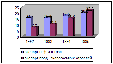 Для современной международной специализации России помимо нефти и газа становится характерной и продукция некоторых других отраслей промышленности, отличающихся, как правило, низкой технологичностью и экологичностью. В их числе - черная и цветная металлургия, базовая химия, целлюлозно-бумажная промышленность. Совокупная доля этих отраслей в российском экспорте за 1992-1996гг. выросла в 2 раза. При этом стоимость экспорта неэкологических отраслей промышленности выше, чем совокупная стоимость вывоза нефти и газа (рис.1).