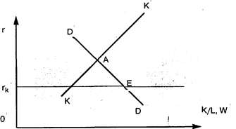 Это равновесие, однако, неустойчиво в длинное время. Его неустойчивость связана с существованием критической величины процента rk. Если r >rk, то чистые сбережения в экономике положительны, при r = rk они равны нулю, а при г < rk отрицательны. Поэтому при любом r > rk предложение капитала увеличивается, но интенсивность этого предложения падает с уменьшением r. На диаграмме этому соответствует сдвиг КК вправо. В результате состояние экономики скользит вниз по DD, приближаясь постепенно к Е. При этом W, K/L и Q/L растут, а r падает. В точке Е r =rk и уменьшение желания сберегать прекращает дальнейшее накопление капитала. W и r перестают изменяться. Это может произойти при высоком уровне дохода и выпуска, если было накоплено значительное количество капитала.