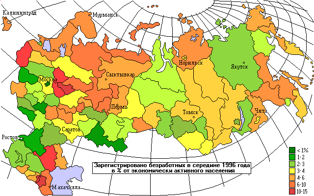 В России в начале 1992 года зарегистрированная безработица составляла 0.1% экономически активного населения. За последние 4 года процент безработицы значительно вырос и в 1996 году достиг 3.7%, что соответствует 2.6 миллионам безработных. Понятие безработицы, используемое МОТ несколько шире и учитывает также людей, не имеющих работу, но не зарегистрированных на бирже труда. В соответствии с методикой МОТ, которой придерживается Госкомстат РФ, в марте 1996 года в России было 6.2 млн. безработных (8.5% рабочей силы). По регионам зарегистрированная безработица распределяется неравномерно [1].