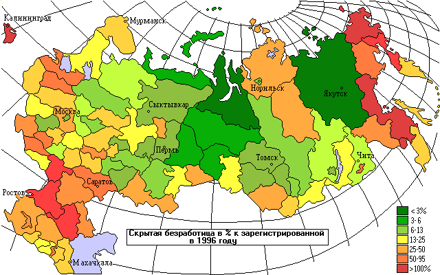 На Европейской части страны имеются две крупных зоны скрытой безработицы - степные регионы низовий Волги и Дона, и северо-западный экономический район, включая Калининградскую область. Четыре области, три из которых смежные и находятся в самом центре России, характеризуются катастрофическим положением с безработицей - это Ивановская (89,5% от средне российского уровня), Владимирская (56,8%), Ярославская (55%) и Кировская области (41,2%). В целом ситуация с безработицей к востоку от Урала более благополучная, чем к западу от него, а в г. Москве и Якутии - абсолютном рекордсмене по отсутствию безработицы - уровень общей безработицы не превышает 1/10 средне российского показателя.