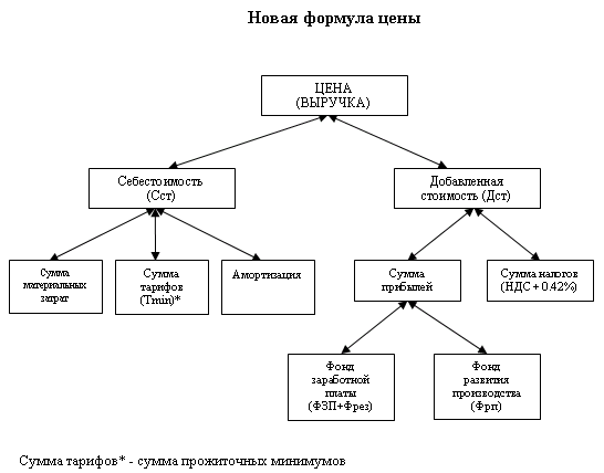 Работа предприятия на основе коллективно-частно-личной собственности обеспечивается применением формулы образования цены, предложенной экономистом (академическим советником) Ю.Г.Фейгиным. Ее блок-схема приведена. на рис. 1. Данная схема образования цены одновременно позволяет определить и фонд заработной платы (ФЗП), и фонд развития производства (ФРП). И то и другое определяется как на этапе планирования, так и на этапе распределения фактической выручки.