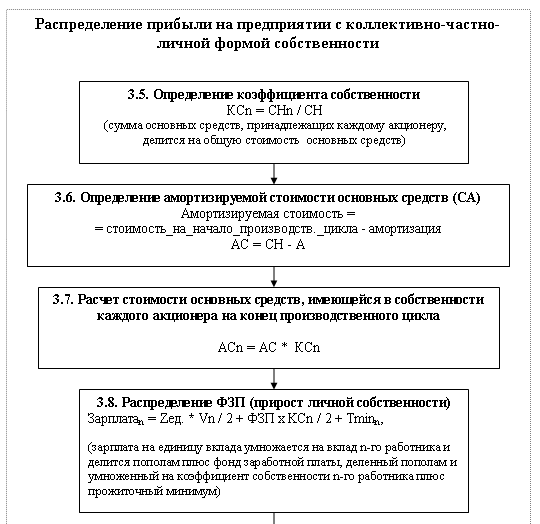 Начало распределения фонда заработной платы (ФЗП) на предприятии, использующем коллективно-частно-личную форму собственности ничем не отличается от распределения, рассмотренного в главе II (личная и частная формы собственности). Повторим, для полноты, принцип данного распределения: