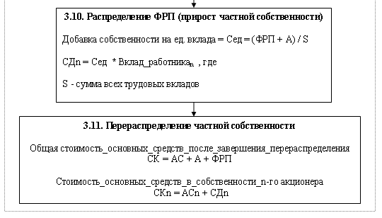 Особенность данного способа распределения состоит в том, что в распределении участвует не только фонд заработной платы (ФЗП), но и фонд развития производства (ФРП), являющийся, наряду с ФЗП, второй частью прибыли предприятия (см. рис.1). Но, если фонд заработной платы делится с целью непосредственной выплаты его работникам (личная собственность), то распределение фонда развития производства преследует накопительную цель с тем, чтобы накопленный, распределенный и осевший в основных средствах результат влиял впоследствии на величину заработной платы каждого работника (коллективно-частно-личная собственность). В этом случае факторами, влияющими на эффективность производства, становятся и стаж работника, и его вклад в производство, отражаемый квалификацией ("весом") работника и коэффициентом участия в производстве, и возможные инвестиции каждого работника в производство.