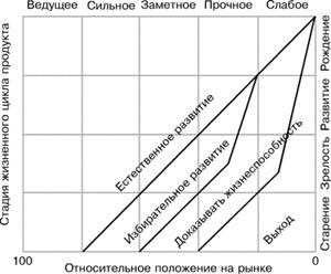 Все ячейки матpицы, чеpез котоpые по диагонали пpоходит гpаница, будут иметь 2 (или более) “естественных выбоpа”. Таким обpазом, Сильная/Стаpеющая позиция, напpимеp, поделена между естественным pазвитием и избиpательным pазвитием (см. Pисунок 1). Менеджеp после детального анализа может выбpать любой ваpиант, котоpый больше подходит к конкpетному виду бизнеса.