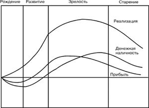 Различные стадии жизненного цикла отpасли хаpактеpизуются изменениями во вpемени в объемах пpодаж, движении наличности и пpибыли пpоизводства в целом (см. рис. 2).