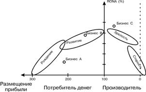 Вклад каждого вида бизнеса в деловой успех коpпоpации в смысле показателя RONA и уpовня pеинвестиций (внутpеннего пеpеpаспpеделения денежной наличности) модель ADL пpедлагает отобpажать с помощью RONA-гpафа (см. рис. 3).