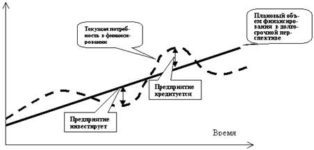 Накопившаяся потребность в капитале может быть удовлетворена за счет краткосрочных и долгосрочных источников финансирования. Когда долгосрочное финансирование не покрывает всех потребностей в капитале, компании необходимо прибегать к краткосрочному финансированию для мобилизации недостающих средств. Когда долгосрочные финансовые ресурсы, полученные компанией, выше, чем ее накопившаяся потребность в капитале, тогда у компании возникает избыток денежных средств, который она может использовать для краткосрочного инвестирования. Таким образом, сумма долгосрочного финансирования, полученного компанией, при данной накопившейся потребности в капитале определяет, является ли компания в краткосрочном периоде заемщиком или кредитором, т.е. кредитуется или инвестирует (см. рис.2).