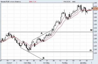 Далее, "быки" делятся, в основном на 2 класса. "Быки"-реалисты ждут достижения ценами максимума (далее - М) и тогда начинают продажи акций. "Быки"-экстремисты ориентируются на выход цен к новым высотам, обычно - к верхней границе восходящего канала (А). Аналогично, "медведи"-реалисты будут покупать у уровня поддержки (т.е. на минимуме; далее - m), а "медведи"-экстремисты рассчитывают купить у нижней границы падающего канала (В). Спекулянты ориентируются на наклон в момент времени t скользящих средних (СС) и в зависимости от этого берут сторону "быков" или "медведей". Используя эти соотношения, получим типовую формулу для вычисления математического ожидания цены акций к моменту t + Т: