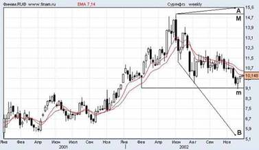 Другой пример. На рис.2 показаны реальные котировки акций компании "Сургутнефтегаз" за период с января по ноябрь 2002 г. Пусть t = 30.06, t + T = 30.11. Определим математическое ожидание МО на 30.11 (т.е. на 5 месяцев вперед) по формуле (2). В этом случае, А = 15.6, В = 5.5, М = 15, m = 9.1, Сt = 12.3, а СС направлена вниз, т.е. М V m = m. Подставляя эти значения в формулу (2) получаем, что