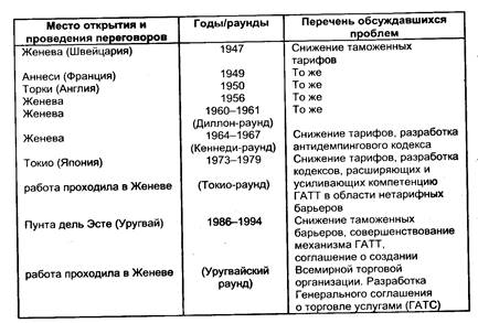 Текущая деятельность ГАТТ состояла в проведении многосторонних встреч-раундов, во время которых обсуждаются внесенные на повестку дня вопросы, связанные с регулированием внешней торговли стран-участниц. Всего с момента создания и по настоящее время в рамках ГАТТ было проведено восемь таких раундов. Нижеприведенные данные показывают время и место проведения раундов, а также перечень обсуждавшихся на этих переговорах проблем [см. схему].
