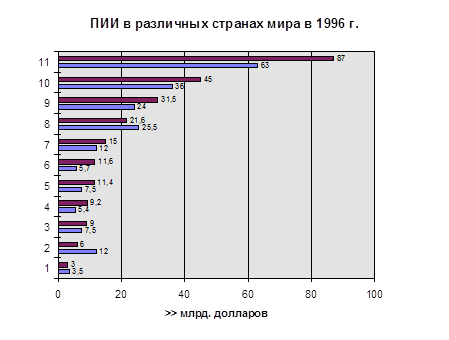 Накопленный же объем иностранных инвестиций в экономику России к середине 1996 г., составлял 10,7 млрд. долл. (примерно 15-е место в мире). На ее долю приходилось около 10 % общего объема мировых прямых зарубежных инвестиций.