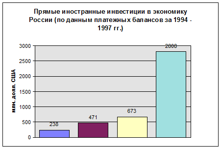По состоянию на 1 июля 1997 г., по оценке, накопленный иностранный капитал в экономике России (без учета органов денежно-кредитного регулирования и банковского сектора) составил около 18 млрд. долларов США (в том числе за 1991 – 1993 гг. поступило 3 млрд. долларов США, за 1994 г. – 1 млрд. долларов США, в 1995 г. – 3 млрд. долларов США)