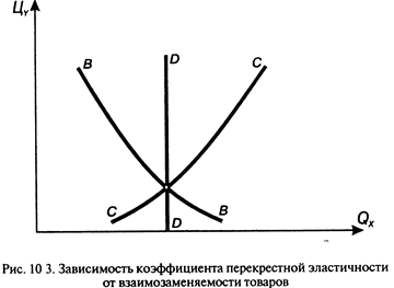 Концепция перекрестной эластичности позволяет понять явления взаимозаменяемости и взаимодополняемости товаров. Если коэффициент перекрестной эластичности спроса имеет положительное значение, то есть количество спрашиваемой продукции Х варьирует в прямой зависимости от изменения цены продукта Y, то продукты Х и Y являются взаимозаменяемыми товарами. Чем больше положительный коэффициент, тем больше степень заменяемости двух данных товаров. Если коэффициент перекрестной эластичности имеет отрицательное значение, то товары Х и Y являются взаимодополняемыми товарами. Чем больше величина отрицательного коэффициента, тем больше взаимодополняемость двух данных товаров. Нулевой или почти нулевой коэффициент свидетельствует о том, что два товара не связаны между собой, то есть являются независимыми товарами.