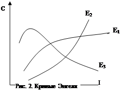 На основе анализа взаимосвязи между изменением дохода и спросом на разные товары можно построить график «доход-расходы» для отдельно блага (при предположении, что цена блага остается неизменной). Такие графики называют кривыми Энгеля. На рис.2 показан примерный вид кривых Энгеля для нормальных товаров (кривая Е1 ), предметов роскоши (кривая E2 ) и низкокачественных товаров (кривая Е3 ). На оси абсцисс откладывается уровень дохода (I), а на оси ординат - расходы на потребление данного блага (С).