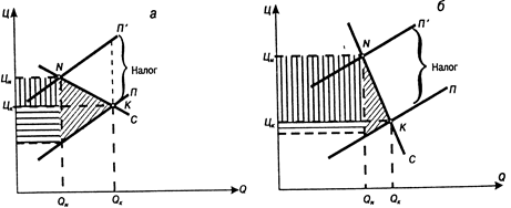 Предложение до введения налога характеризуется линией П после введения налога — П’, т.е. линия предложения сместилась влево вверх на величину налога. Равновесное состояние переместилось из точки К в точку N , что указывает как на повышение цены, так и на сокращение объема продукции. Однако производитель не может установить цену выше равновесной, так как в условиях конкуренции он будет вытеснен с рынка. Единственное, что он может сделать, это поднять цену до равновесного уровня.