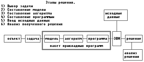 Чтобы человеку принять решение без ЭВМ, зачастую ничего не надо. Подумал и решил. Человек, хорошо или плохо, решает все возникающие перед ним задачи. Правда никаких гарантий правильности при этом нет. ЭВМ же никаких решений не принимает, а только помогает найти варианты решений. Данный процесс состоит из следующих этапов: